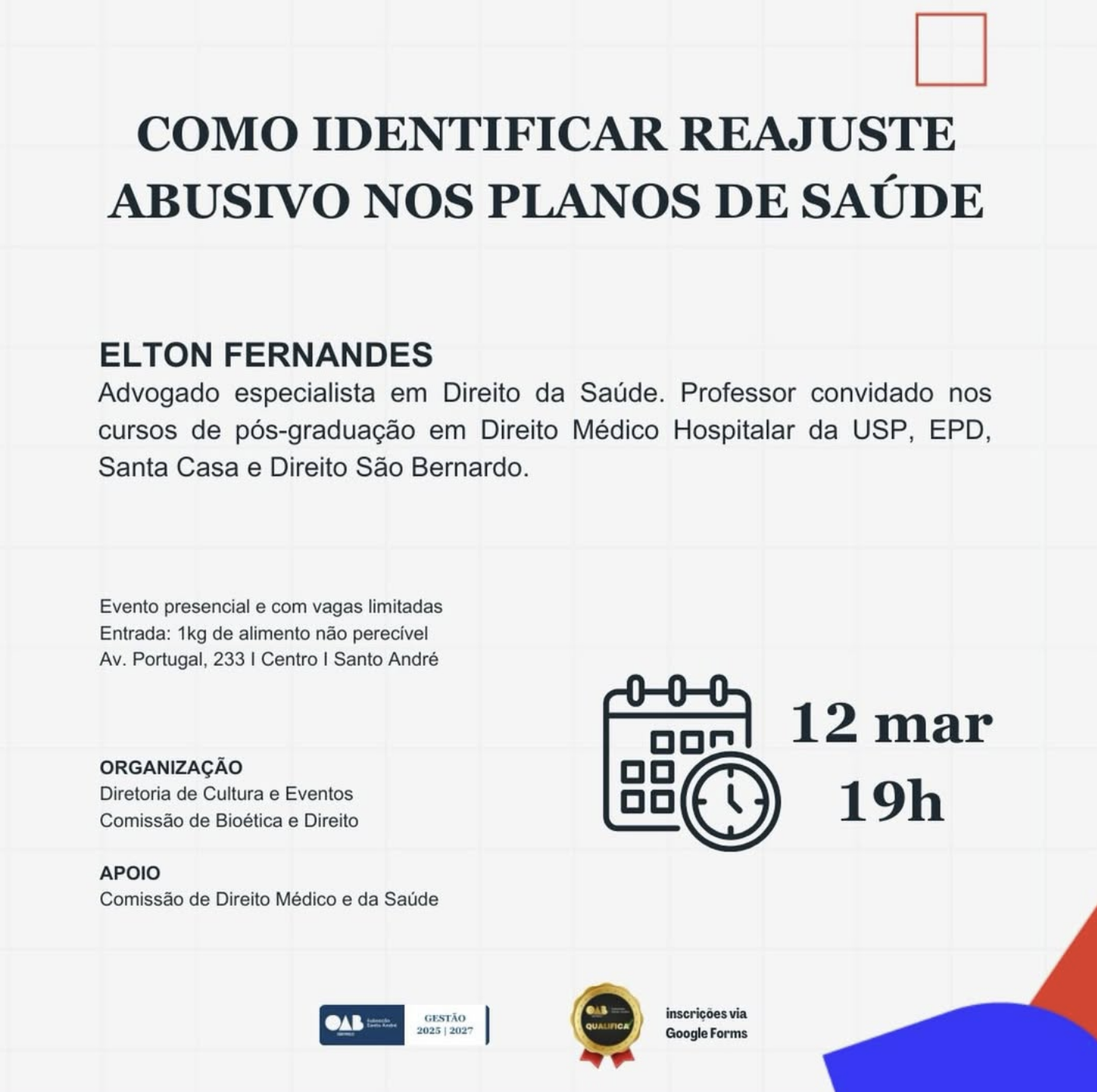 A OAB Santo André convida para a palestra “COMO IDENTIFICAR REAJUSTE ABUSIVO NOS PLANOS DE SAÚDE”, o evento acontecerá no dia 12 de março, às 19h, na Casa da Advocacia e Cidadania Andreense.