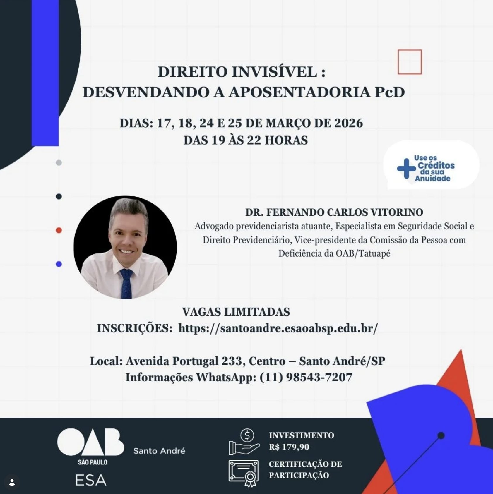 Advogado previdenciarista atuante, Especialista em Seguridade Social e Direito Previdenciário, Vice-presidente da Comissão da Pessoa com Deficiência da OAB/Tatuapé