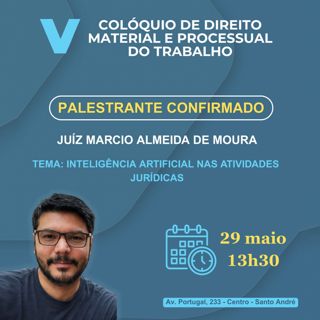 Dr. Márcio trará sua experiência da magistratura trabalhista para debater questões atuais e práticas do Direito do Trabalho no colóquio apresentando o tema : INTELIGÊNCIA ARTIFICIAL NAS ATIVIDADES JURÍDICAS.