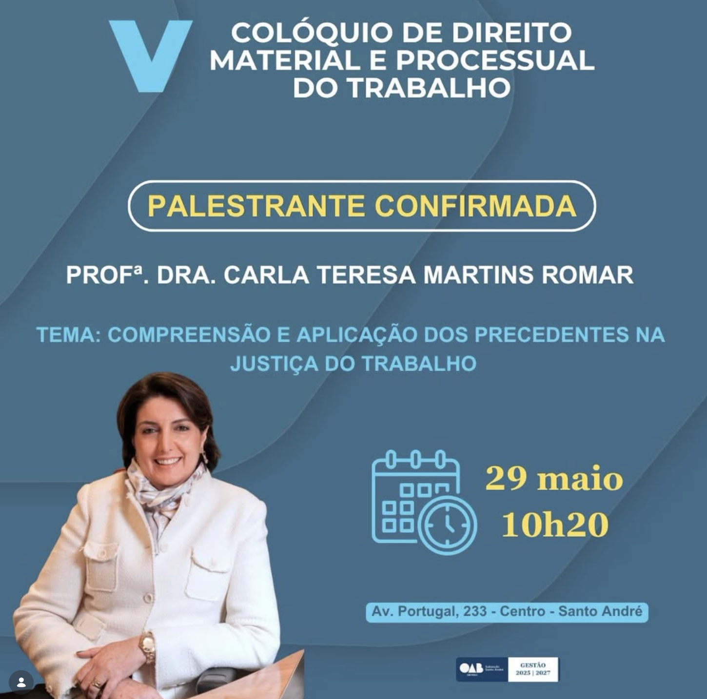 Dra. Carla trará importantes reflexões sobre o tema: COMPREENSÃO E APLICAÇÃO DOS PRECEDENTES NA JUSTIÇA DO TRABALHO uma oportunidade imperdível para profissionais e estudantes da área!