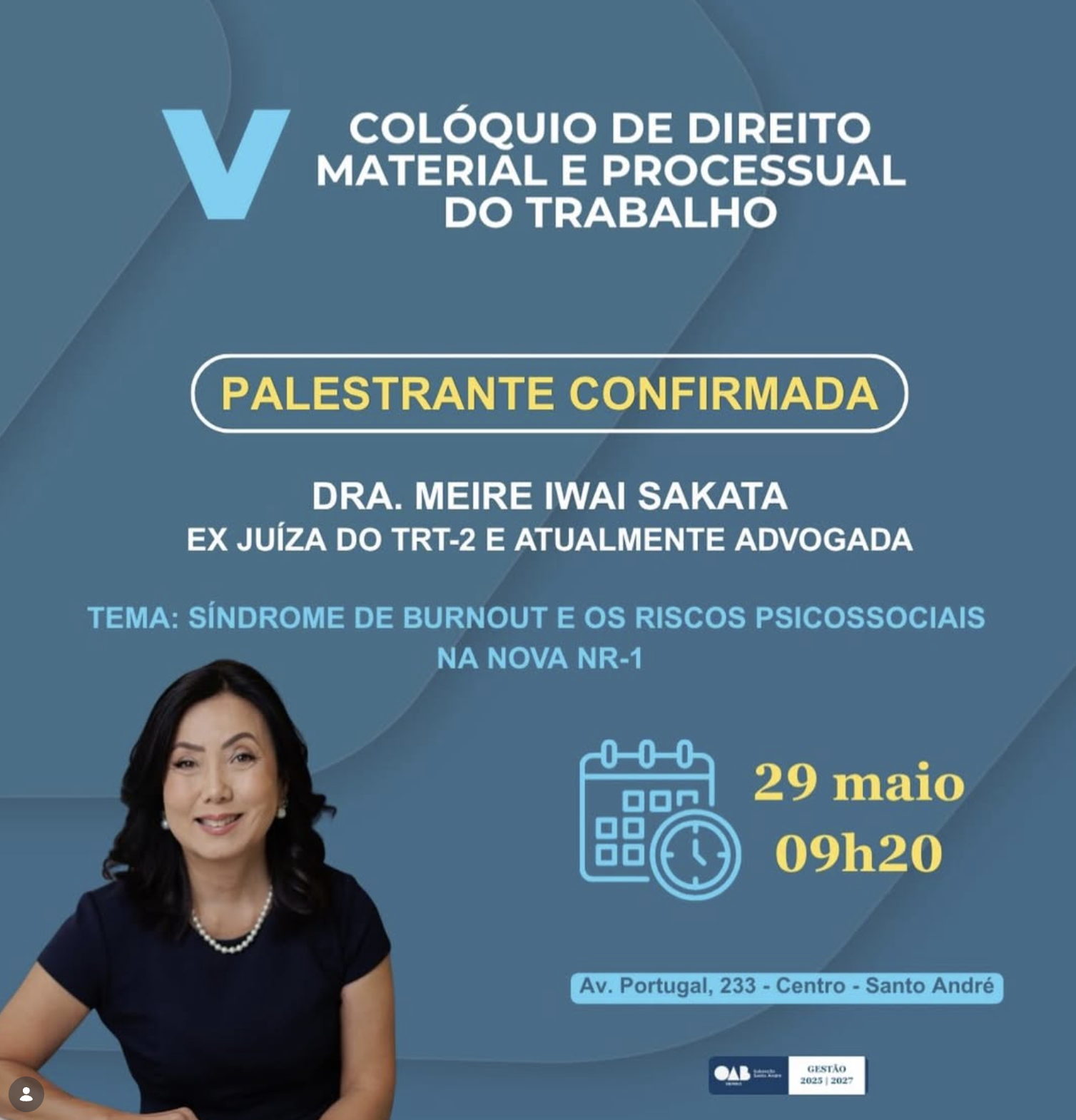 Dra. Meire possui ampla experiência na magistratura trabalhista e atualmente atua na advocacia, trazendo sua expertise em Direito Material e Processual do Trabalho para o colóquio com um tema atual explicando a SÍNDROME DE BURNOUT E OS RISCOS PSICOSSOCIAIS NA NOVA NR-1.