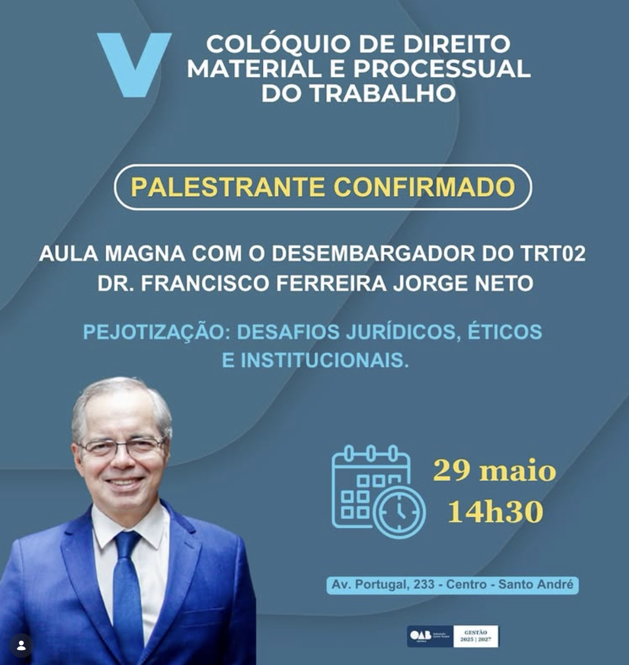 É com grande satisfação que a Diretoria da 38ª Subseção de Santo André convida para o “V Colóquio de Direito Material e Processual do Trabalho”. O evento ocorrerá no dia 29 de maio, das 8h30 às 16h30 e contará com a presença de ilustres profissionais do Direito do Trabalho.