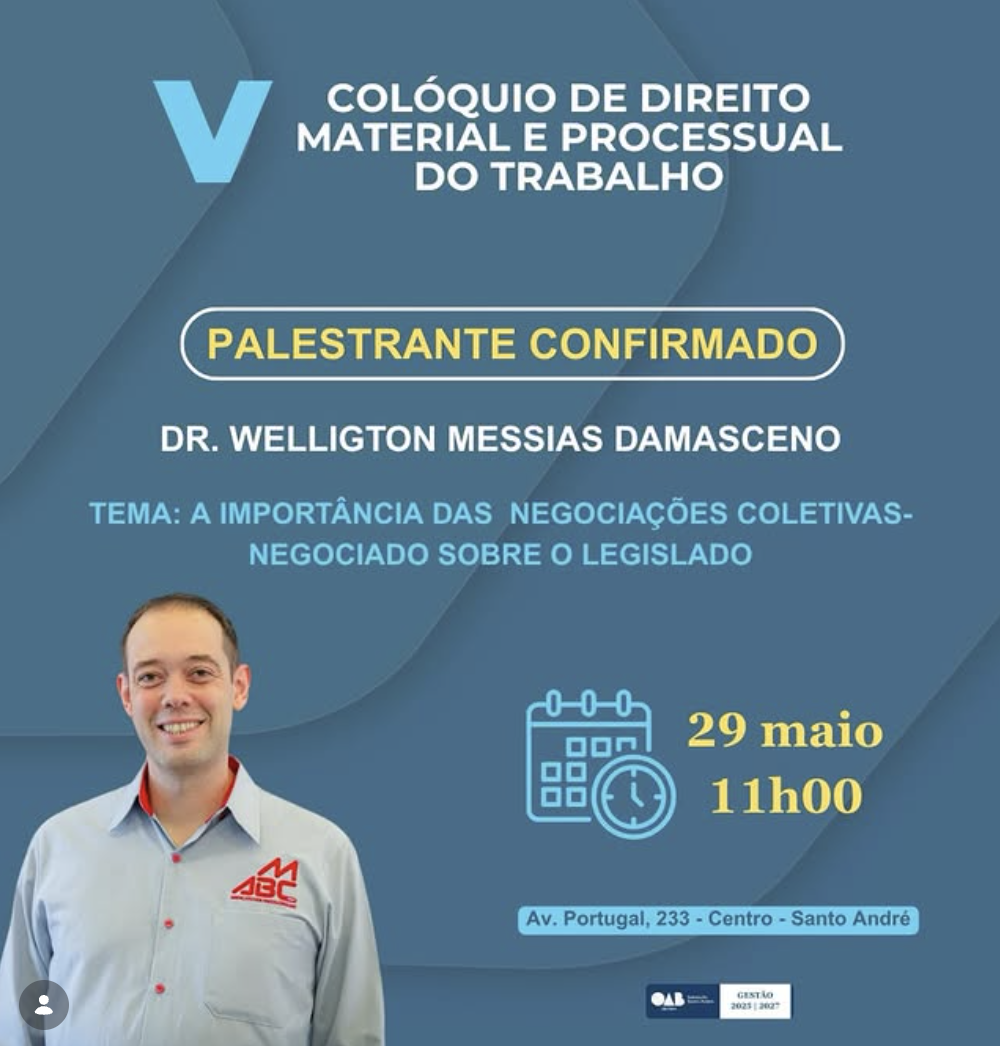 Dr. Wellington trará para o colóquio o tema: A importância das Negociações coletivas - Negociado sobre o legislado. Abordando aspectos contemporâneos e relevantes para a compreensão das transformações nas relações de trabalho