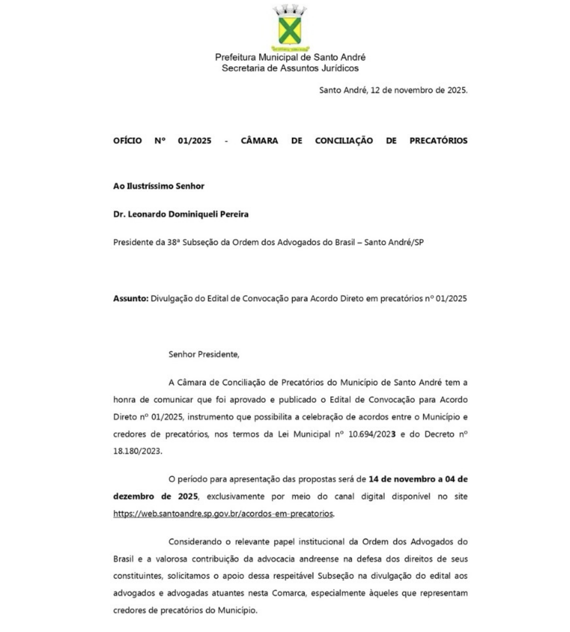Considerando o relevante papel institucional da Ordem dos Advogados do Brasil e a valorosa contribuição da advocacia andreense na defesa dos direitos de seus constituintes, solicitamos o apoio dessa respeitável Subseção na divulgação do edital aos advogados e advogadas atuantes nesta Comarca, especialmente aqueles que representam credores de precatórios do Município.
