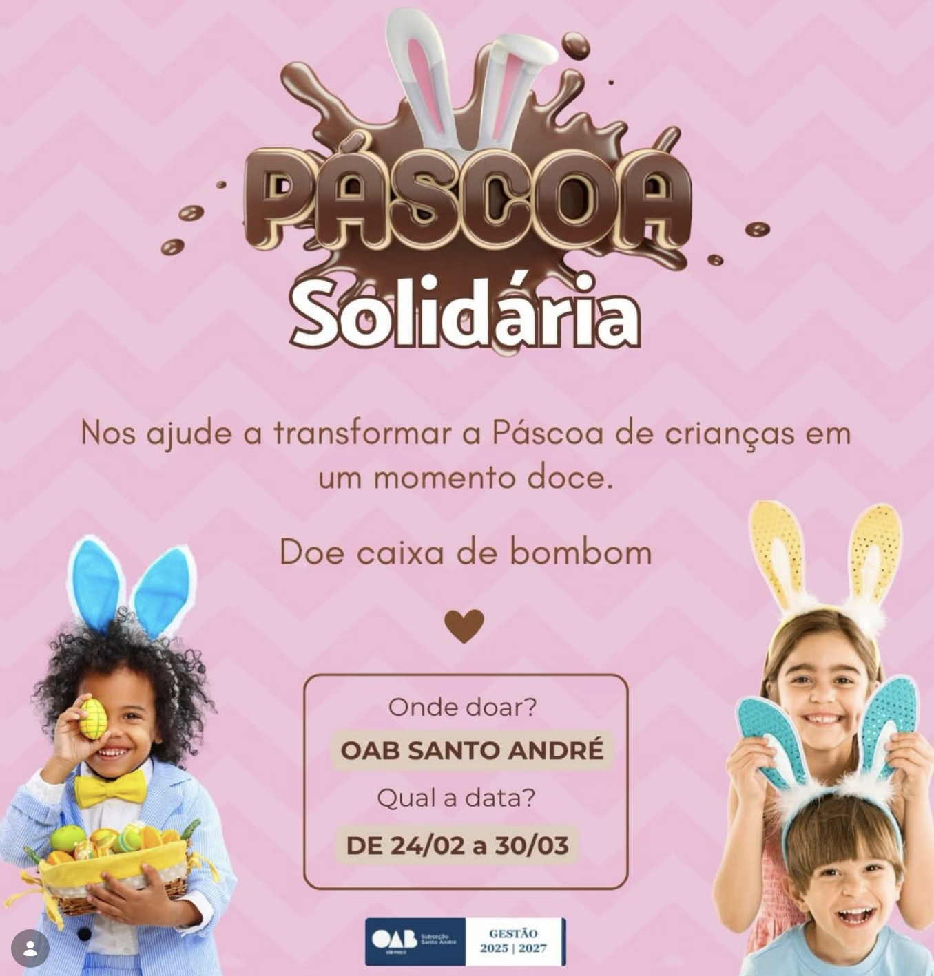 A OAB Santo André convida você a participar da Páscoa Solidária! Estamos arrecadando caixa de bombom até o dia 30 de março. A arrecadação será feita para instituições cadastradas na região de Santo André.